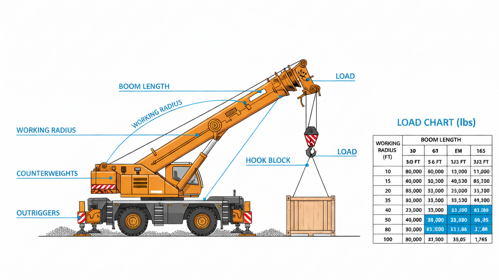Crane load charts define the maximum safe lifting capacity based on boom length, working radius, and crane configuration. Understanding how to read and apply load chart information allows operators and lift planners to safely plan lifts, avoid overload conditions, and prevent crane tipping.