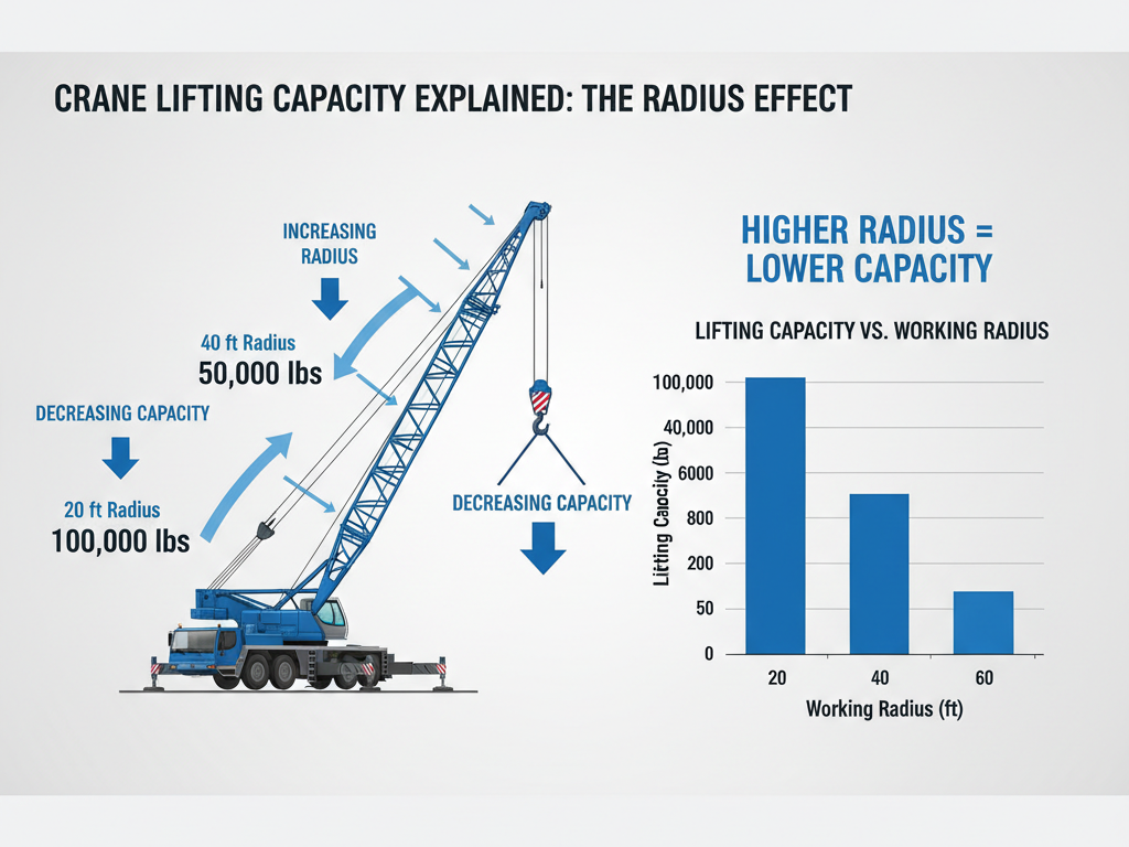 - Assuming maximum crane capacity applies everywhere: Maximum capacity applies only at minimum radius. Capacity decreases as radius increases.
