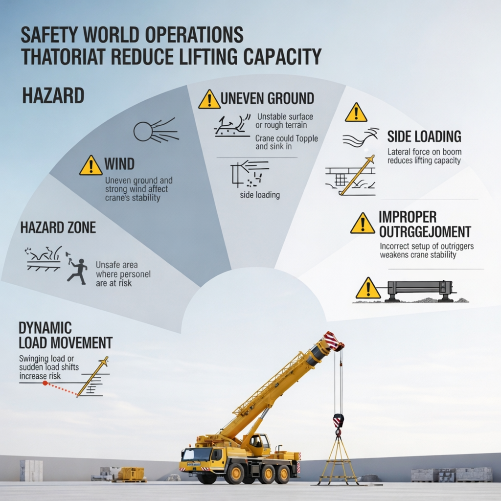 Environmental and operational factors affect lifting safety. Operators must consider real-world conditions beyond load chart values: